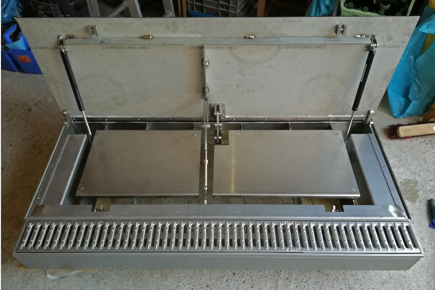 Die stabile Edelstahlkonstruktion erlaubt einen sicheren Schutz für Türöffnungen (z.B. Nebeneingänge zu Keller oder Garage). Der komplette Edelstahlrahmen besteht aus einem 3-seitigen Einlaufschlitz (ohne Einlaufrinne) und ist unten offen für den Wasserablauf in den Kanal bzw. in eine Sickergrube.