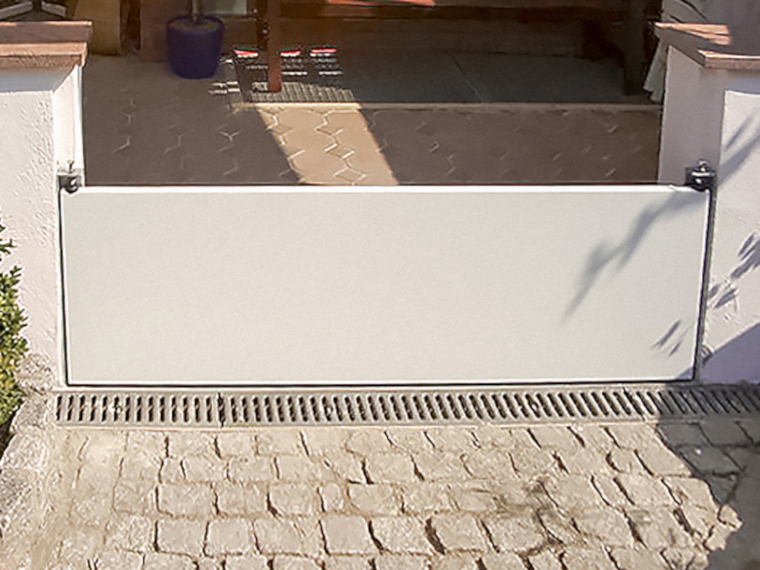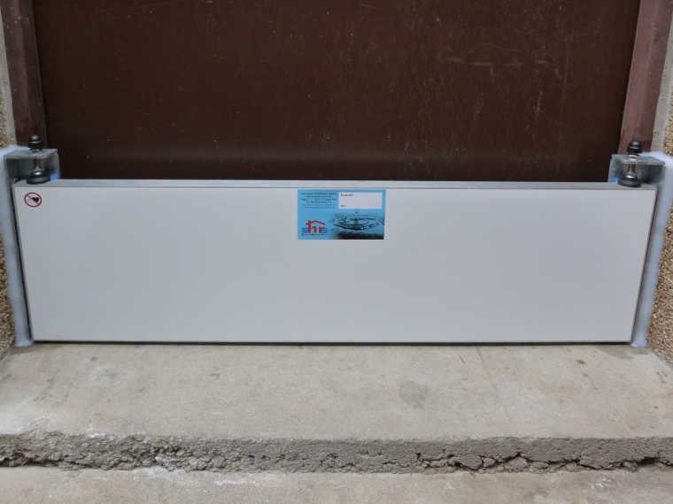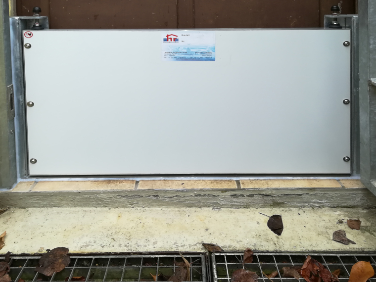 Das Wabenplatten-System besteht aus einer 30 mm starken Alu-Wabenplatte, die exakt für die gewünschte Schutzhöhe konfektioniert wird. Das Waben-System wird vor das zu schützende Objekt gesetzt. Das Hochwasserschutz-System eignet sich unter anderem besonders für Haustüren, Kellerfenster, Durchgänge und Tankraumluken. Das System kann auf die Leibung / Fassade oder in die Leibung montiert werden. Das Wabenplattensystem kann auf Wunsch auch in der Ausführung als Drehtür geliefert werden.